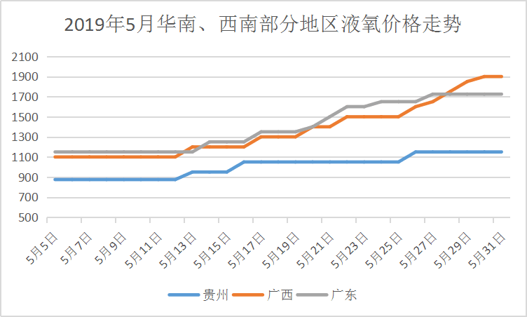 本月华南地区液氧接连走高,持货商心态积极,场内氛围火热。现广东地区主流出厂价格在1700-1750元/吨左右;广西地区液氧出厂价格在1850-1950元/吨左右,两广地区供应面紧俏,利好支撑下交投重心频创新高,月末较月初上涨幅度达40%左右。月初始,供应面暂不宽裕,市场价格推涨热情,进入月下旬厂家惜货销售,业者拿货不畅,重心再度推高。